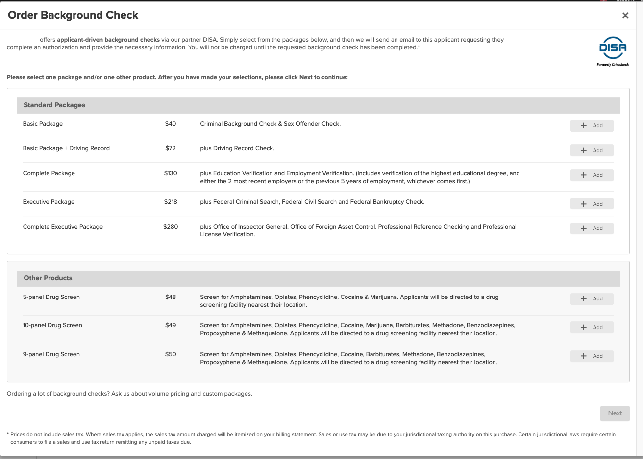Choose one or more background check packages from the list.